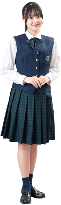 ネイビーのブレザーとダークグリーンのチェックのスカートとネイビーのベスト